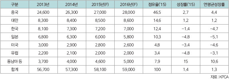 중국의 생산 규모는 270억 달러로 세계 1위다. 전년 대비 2.7% 성장했으며, 연평균성장률도 4.4%로 높다. 대만이 중국에 이어 2위다. 대만의 생산 규모는 85억 달러이며, 시장점유율은 14.6%다. 주목할 지역은 동남아로 최근 들어 두자릿수 성장을 하고 있다.
