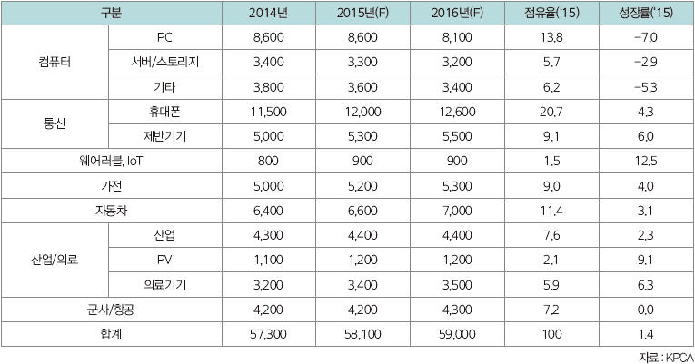 KPCA에 따르면, 2015년 세계 용도별 기판 생산 규모를 살펴보면, 휴대폰을 포함한 통신기기용이 가장 많은 29.8%를 차지했다. 전년 대비 5% 성장한 수치다. 반면, 전통적인 컴퓨터용 기판 생산 규모는 점점 줄어들고 있다. PC, 서버/스토리지 등의 전년 대비 마이너스 성장률을 기록했다. 올해는 전반적인 시장 상황이 좋지 못하지만, 웨어러블/IoT, PV(태양광모듈 등), 의료기기, 자동차 분야는 성장세가 이어질 것으로 예측됐다.