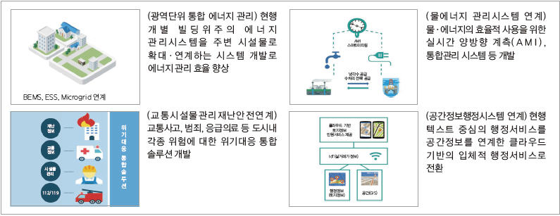 첫째, 개별 인프라 연계를 통한 요소기술 고도화다. 교통, 에너지, 물 등 도시 내 각종 인프라 중 상호 시너지를 낼 수 있는 개별 인프라 시스템을 연계 통합해 요소기술을 고도화하는 것이다. 개별 건물 위주의 에너지 관리를 주변 시설물까지 확대하는 시스템, 교통-시설물 관리-재난안전을 연계해 통합 대응하는 시스템 등 다양한 인프라를 연계하는 핵심기술을 개발한다는 계획이다.