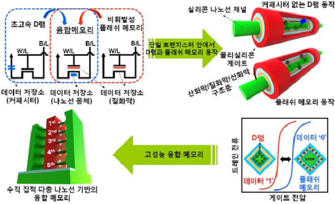 이번 개발에 성공한 연구팀(전기 및 전자공학부 최양규 교수와 이병현 박사과정)은 빠른 속도를 지원하는 D램과 전력소모가 적은 플래시 메모리의 기능이 하나의 트랜지스터 안에서 동시에 동작하는 전면-게이트 실리콘 나노선 구조 기반의 융합 메모리 소자 개발을 위한 연구를 진행했다.