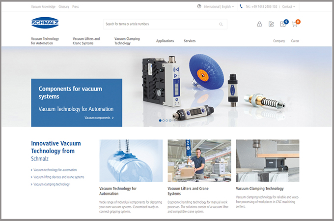 사이트 방문자는 회사, 최신 뉴스 등 필요한 모든 정보를 콤팩트하고 클리어한 구조에서 확인할 수 있으며, 특히 진공 구성부품과 그리핑 시스템, 매뉴얼 핸들링 및 크레인 시스템, 클램핑 솔루션의 정보도 제공받을 수 있다.