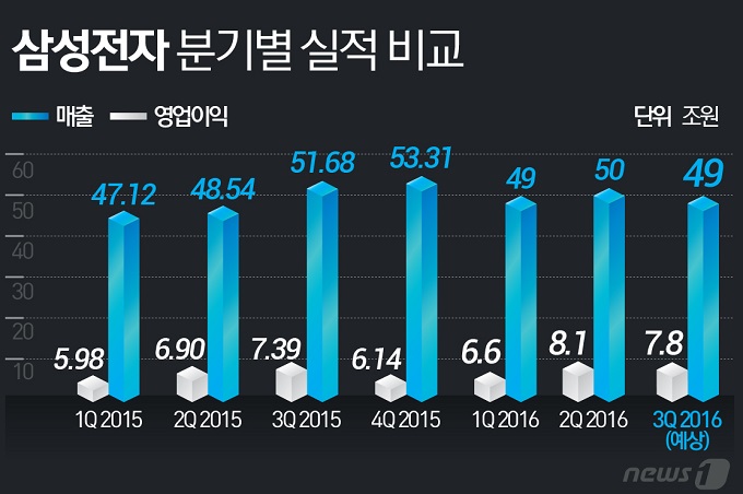 유종우 한국투자증권 연구원은 "3분기에는 갤노트7 리콜 및 판매차질로 영업이익이 하락했지만 4분기에는 8조4000억원으로 다시 회복할 전망"이라며 "반도체와 디스플레이 부문의 이익 증가가 계속되며 다시 8조원대 이익 달성이 가능할 것"이라고 관측했다.