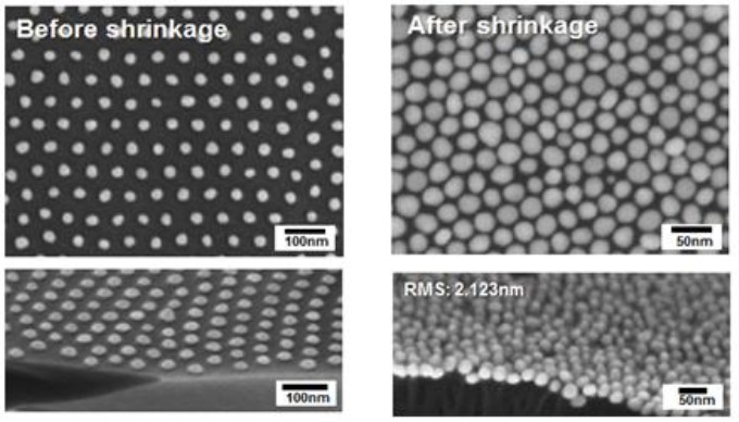 ▲(좌) 수축공정을 실시하기 전 분자제어조립 기술을 통해 형성된 금속나노입자 (우) 수축공정 후 매우 근접한 금속나노입자에 대한 주사 전자 현미경 이미지/사진=연구팀 제공