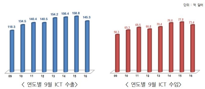 산업통상자원부는 2016년 9월 정보통신기술 부문 수출과 수입 실적을 13일 발표했다. 자료에 따르면 ICT 총 수출은 145억 3천만 달러, 수입은 73억 4천만 달러를 기록, 무역수지는 71억 9천만 달러 흑자에 이른 것으로 잠정 집계됐다.