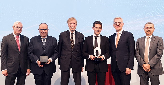▲ (왼쪽부터) ABB 피터 보저 회장, 로니 벨만스 교수, 후베르투스 본 그륀베르크 박사, 제프 그리텐 박사, ABB 울리히 스피스호퍼 CEO, ABB 최고기술경영자 바즈미 후세인.