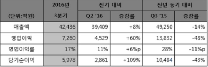 ▲ SK하이닉스 2016년 3분기 경영실적 [자료=SK하이닉스]