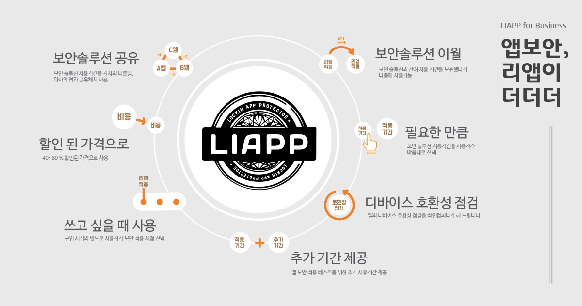 모바일 보안 전문기업 락인컴퍼니가 보안 솔루션의 ‘공유’와 ‘이월’하기를 선보였다. 이 서비스는 애플리케이션 통합 보안 솔루션 ‘리앱 포 비즈니스’의 잔여 사용 기간을 다른 앱에 나눠주는 개념이다.