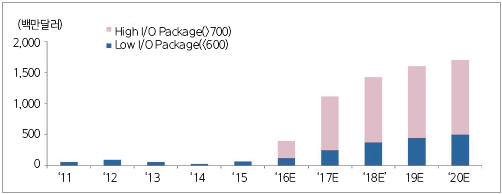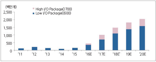 그림 1과 그림 2에서 보듯이 매출액 기준으로는 AP를 비롯해 I/O count가 700개 이상인 High I/O 패키지가 성장을 주도하고, 수량 기준으로는 Baseband, Transceiver, PMIC, Microcontroller 등 I/O count가 600개 이하인 Low I/O 패키지가 다수를 차지할 것이다.