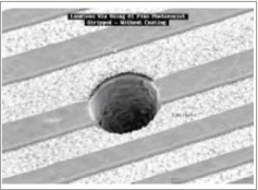 최근 개최된 PCB West 회의에서 러시아의 PCB 제조업체와 이야기할 기회가 있었다. 러시아 또한 일본의 컴퓨터에서 이를 본 후 랜드리스 바이어스를 사용하는 것처럼 보였다. 러시아의 공정은 상당히 참신했다. 이걸 내가 생각해냈어야 하는데! 이들은 산소에 민감한 필름 포토레지스터의 성질을 사용하였다. 건식 필름을 패널에 부착할 때, 산소를 채운 장치 주변에 막을 씌웠다. 이로 인해 산소는 건식 필름을 통해 구멍에 갇히게 된다. 패널을 일반적인 도판과 함께 노출시켰다(그러나 랜드리스 바이어스와 연결될 경로에 대한 랜드는 없다). 그리고 패널을 100°C로 짧게 구운 후 건식 필름에 있는 커버 시트를 제거한 후 보통과 같이 현상시켰다. 산소와 열이 구멍의 지름과 정확히 같은 지름으로 내부로부터 건식 필름을 중합화시켰다. 그러므로 현상 시, 바이어스는 완벽한 건식 필름 등록이 이뤄지며 랜드리스가 된다.