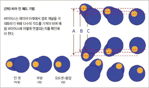 “바이어스를 경로 생성을 위한 내부 레이어에 있는 넓은 간격을 구성하는 볼 패드에서 떨어진 곳에 ‘스윙’시키는 게 원칙이다. 마이크로 바이어스의 크기, 핀-피치와 볼 패드의 크기에 따라, 마이크로 바이어스를 열과 행에 맞춰 정렬시킬 수 있다. 이를 통해 경로 작성에 가용한 공간이 극대화된다.”[6]