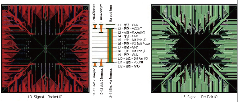 ▲ 그림 7. 스택업 관점에서 Virtex 5, 1760 pin FPGA, 레이어 3 및 5 발생 경로에 관한 예