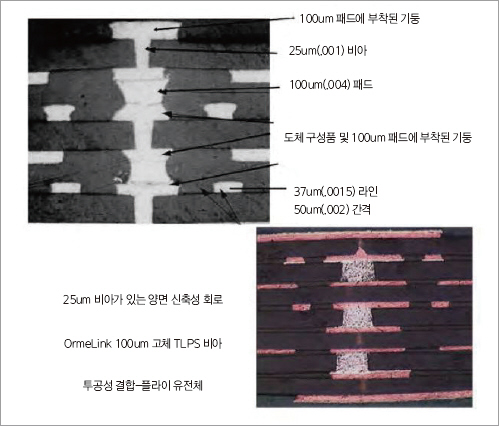 Ormet 구조는 폴리마이드 또는 FR-4 레이어 쌍으로 구성된다. 강성 코어나 열 확산장치가 필요한 경우 여러 물질을 혼합할 수 있다. 전도 페이스트는 구리-주석의 TLPS 링크이다. 그림 10에 구조가 나와 있다. 그림 11은 레이저-비아 폴리마이드 쌍으로 된 두 개의 완성된 회로 단면적을 보여주고 있으며 매립된 TLPS 바이어스와 함께 레이어쌍과 FR-4 내부 레이어를 연결하는 TLPS 고체 야금 바이어스가 함께 있다.