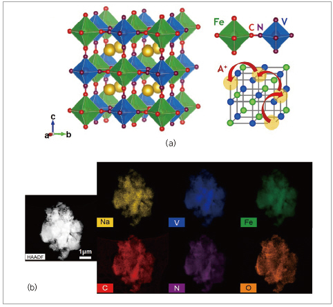 ▲ 그림 1. 철/바나듐 프러시안 블루 아날로그의 결정구조 및 원소 분포(철/바나듐 프러시안