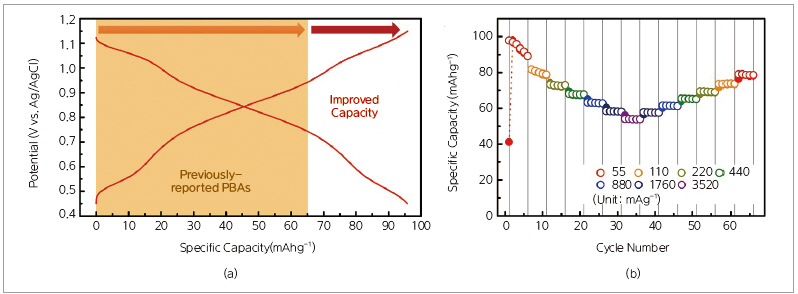 연구진은 철/바나듐 프러시안 블루 아날로그 소재가 기존 동일 군 소재(60mAhg-1) 대비 150% 이상의 높은 에너지 저장 용량(∼100mAhg-1)을 발현하며 100%에 이르는 높은 충방전 효율을 나타낼 뿐 아니라 높은 출력 특성을 보이는 것을 실험으로 확인했다(그림 2 참조).