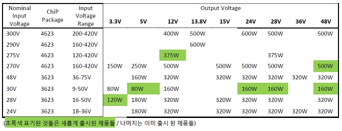 이번에 발표된 다른 세 개의 제품들은 120W에서 3.3V 출력을 내는 3623 ChiP 패키지의 28V nominal 입력 모듈, 275V의 nominal 입력 전압과 12V 출력 값을 갖는 4623ChiP 패키지의 375W 모듈, 4623 ChiP 패키지에서 48V 출력, 500W의 출력을 내며 1,014 W/in3의 전력 밀도를 달성한 270V nominal 입력 모듈이다.