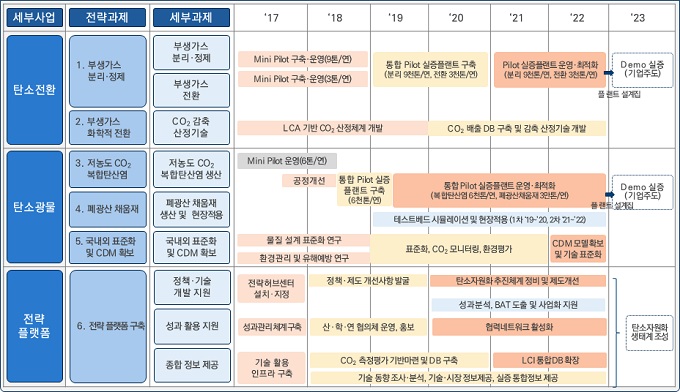 실증 로드맵은 탄소자원화의 두 가지 기술군(탄소 전환·광물) 별로 실증이 가능한 핵심 요소기술을 도출해 추진 내용과 추진전략을 마련하고 추진 일정을 제시한다. 아울러, ‘탄소자원화 전략 플랫폼’을 구축, 실증 사업을 통해 수집된 온실가스 정보를 DB화하여 감축량 산정 기술 개발을 추진하고, 실증성과를 확산하는 계획도 포함하고 있다.