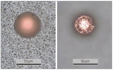 시험에 사용한 레이저가 높은 PRF에서 고출력을 유지하기 때문에 초당 3,000바이어스를 쉽게 초과하는 천공률은 해당 공정에 사용하는 PRF를 높임으로써 쉽게 얻을 수 있다. 그림 3에서 지름이 50μm 정도인 레이저 천공 비아의 현미경 이미지는 ABF를 고품질로 천공하고 회로상 구리 손상을 최소화한 상태로 실시했음을 의미한다. 해당 비아의 경우, 150kHz PRF에서 45펄스를 사용했으며 이는 초당 3,300바이어스 천공률과 동일하다.