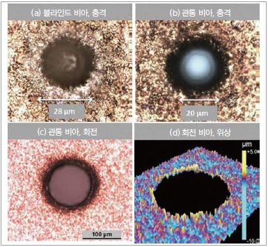 바이어스, (c) 회전 비아 및 펄스 UV 레이저로 생성된 회전 비아의 표면 위상 (d).
