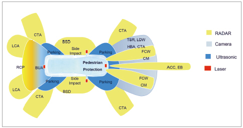 2단계 자율주행차를 둘러싼 ‘안전 코쿤’(그림 2)이 레이더, 카메라, 초음파 및 레이저 센서를 기반으로 개발돼야 한다. 이것은 차선이탈 경고장치(LDW), 차선유지 보조장치(LKW), 전방 충돌 경고장치(FCW), 사각지대 검출(BSD), 상향등 보조장치(HBA), 교통신호 인식(TSR), 후방 카메라(BUA) 등과 같은 기능을 구현해야 한다.