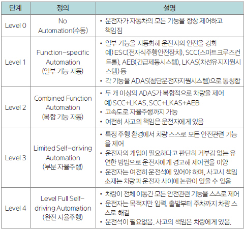 자율주행차는 운전자의 조작 및 개입없이 자동차가 부분적 또는 완전히 자동화 되어 설정된 목적지까지 스스로 이동하는 것을 의미한다. 일반적으로 자율주행 기술 수준 발전을 토대로 자동운전 정도를 5단계로 정의되는데, 현재 국내외 주요 업체들은 5단계 중 2단계 기술인 전자식안정화컨트롤(ESC)이나 크루즈 컨트롤, 자동 정차, 차선 인식 등을 상용화한 상태다. 2020년까지 필요시에만 운전자가 개입하는 3단계 수준의 자율주행차량 양산을 목표로 기술을 개발 중이다.