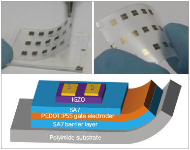 이와 관련, GIST(광주과학기술원) 신소재공학부 정건영 교수 연구팀은 새로운 폴리머 게이트 유전물질 위에 전자이동도가 높은 IGZO 금속 산화물 채널로 구성된 유연한 무기물 기반 트랜지스터를 제작하는 데 성공했다(그림 1 참조).