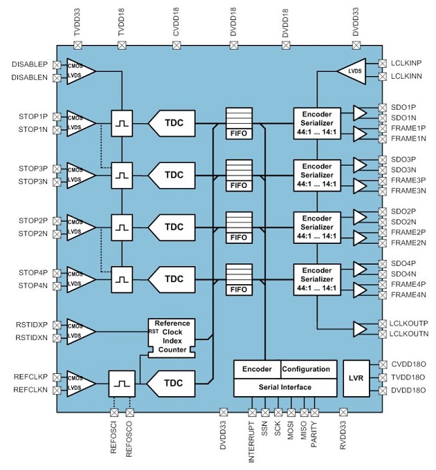 TDC-GPX2는 표준 LVDS(low-voltage differential signaling)와 SPI(serial peripheral interface) 인터페이스를 지원하며, 새로운 소형 9mm x 9mm QFN64 패키지로 제공된다.