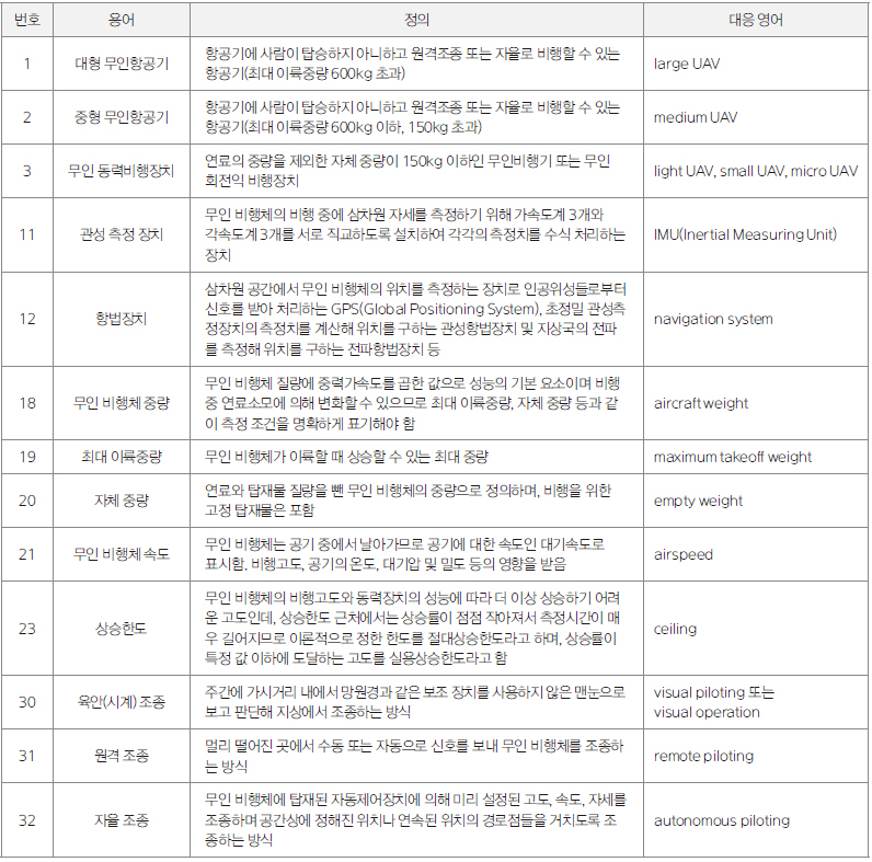 이번에 제정된 국가 표준에는 ‘대형 무인항공기’, ‘원격 조종’ 등 총 52종의 용어가 정의됐고, 최대 이륙중량에 의한 분류, 운용고도에 의한 분류, 운동에너지에 의한 분류 등 6개의 분류 체계에 대해서도 규정되어 있다.