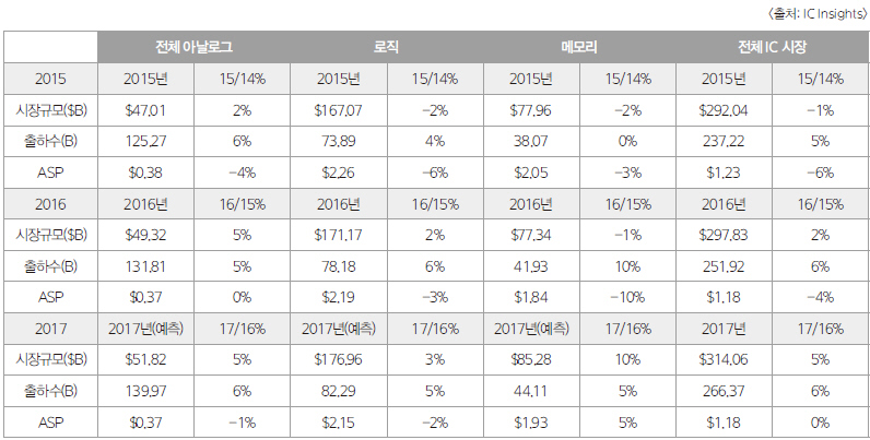 ▲ 표 1. 2015-2017년 아날로그, 로직, 메모리 및 전체 IC 시장 전망 (단위: 백만 달러)