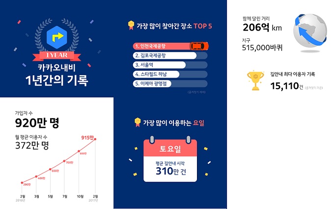 카카오 모바일 내비게이션 ‘카카오내비’가 출시 1주년을 맞아 다양한 기록을 공개했다.