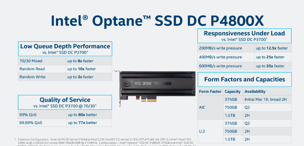 인텔에 따르면 SSD DC P4800X는 선정된 일부 고객들에게 375GB 애드인 카드 형태로 우선 제공된다. 하반기에는 750GB, 1.5TB 크기의 카드가 선보일 예정이다.
