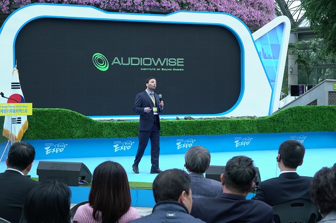 EV프리뷰에서 발표하는 오디오와아즈 관계자.