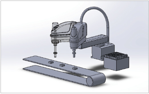 ▲ 스카라 로봇이 컨베이어 동기 기능을 구현하는 모습의 예.