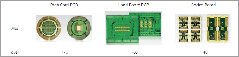 하지만 고성능, 고신뢰성이 요구되는 probe card PCB, load board PCB를 비롯한 특수 PCB의 경우 50층 이상의 초고다층을 가지기 때문에 단순 접합을 통하여서는 특수 PCB를 적층 할 수 없다. 또한 각 층마다 두께공차가 생기면 층수가 많기 때문에 공차가 쌓여 결국 뒤틀림 현상 및 불량품을 생성 할 수 있다. 표 1은 특수 PCB종류별 필요로 하는 층수를 나타내었다.