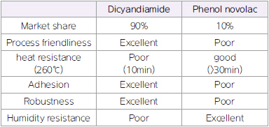 한편 프리프레그의 재료로 사용되는 Dicyandiamide와 Phenol novolac의 단점을 에폭시와 결합하여 결점을 제거하는 논문이 발표된 적도 있었다. 8) 표 2는 Dicyandia-mide와 Phenol novolac의 특성을 나타냈다.