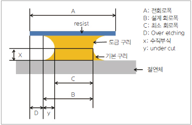 y로 회로 가장 자리에서 측정한 최대 움푹 패인 홈의 최고 깊이 사이의 거리를 말한다. 에칭에 있어서 under cut이 적은 것이 목표로 이상적인 회로가 달성될 수 있다.