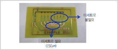 본 과제에서는 미세회로 형성시 복잡한 공정이 아닌 매우 간단하게 미세회로를 형성하여 제조시간을 단축 하고자 하였으며 또한 본 과제에서는 그림 17에서와 같이 필요한 부분만 미세회로를 형성하여 일반 회로의 형성은 기존 방식의 값싸고 효율적인 공정의 장점과 국소 부위를 효율적으로 미세선폭 구현 가능한 방식의 융합을 통해 각각의 장점만을 이용하여 값싸고 빠르게 구현하고자 한다.