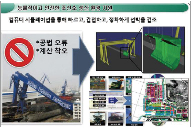 조선소에서는 크레인을 사용해 수천톤의 무거운 중량물 블록을 조립하는 위험하고 어려운 작업들을 수행하고 있다. 이 과정에서 오류로 인해 사고가 나면 엄청난  인명 및 재산 손실이 일어난다. 이에 복잡하고 어려운 작업들은 생산 시뮬레이션을 통해 사전에 문제점을 파악하고 해결해야 한다. 복잡한 계산 및 처리를 컴퓨터로 미리 빠르게 처리함으로써 보다 간편하고 정확한 결과를 얻어낼 수 있다. 실제 생산현장에 맞는 빠르고 정확한 생산 계획은 안전하고 능률적인 생산 환경으로 변화할 수 있으며, ‘스마트 조선소’로 발돋움할 수 있다.
