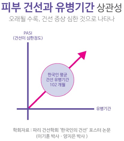 실제로 강남동약한의원의 이기훈, 양지은 박사가 파리 건선학회에서 발표한 한국인의 건선에 관한 포스터 논문에 따르면, 우리나라 건선 피부염 환자의 평균 유병 기간은 108개월에 달하는 데다, 유병 기간이 길어질수록 건선 증상이 심한 정도를 나타내는 PASI 수치 또한 높은 것으로 나타났다. 즉, 건선을 앓은 지 오래될수록 증상이 심해지는 경향이 있는 것이다.