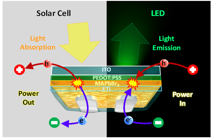 연구팀은 빛에너지의 흡수와 발광이 모두 가능한 페로브스카이트 물질을 사용하여 단일 소자에서 발전과 발광이 모두 가능한 새로운 복합기능성 소자를 만들고, 이를 페롭트로닉 소자(Peroptronic device)라고 명명했다.