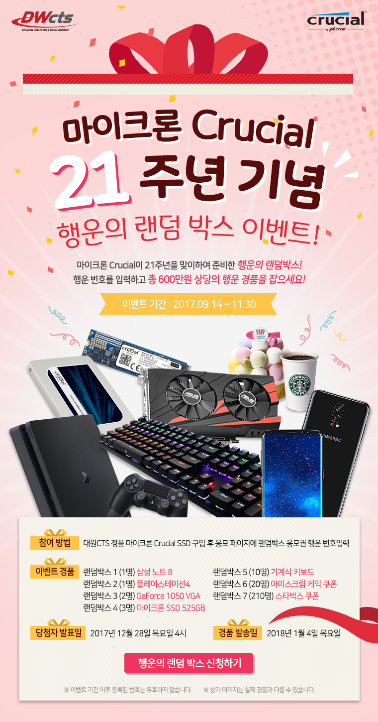 14일부터 오는 11월 30일까지 약 11주간 진행되는 이번 행사는 대원 CTS 정품 SSD 구매자를 대상으로 마이크론 크루셜 1TB SSD를 시작으로 삼성 갤럭시 노트8, 소니 플레이스테이션4, 그래픽카드 및 기계식 키보드 등 총 1,000여만원 상당의 경품을 제공한다.