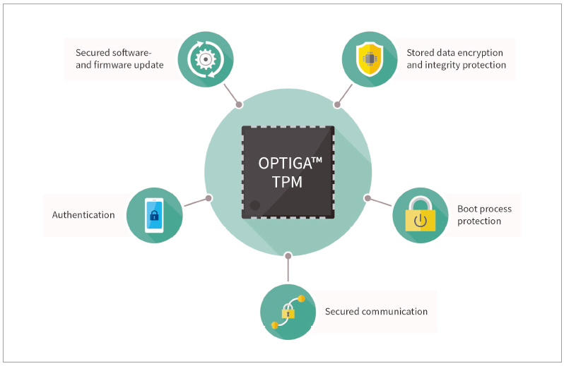 Trusted Platform Module(TPM)은 스마트 팩토리의 하이엔드 장비에 사용하기에 적합하다. TCG(Trusted Computing Group)에서 정의하고 있는 TPM이란 좀더 보안적으로 안전한 컴퓨팅 환경을 구현할 수 있는 보안 칩을 말한다. TPM은 주로 컴퓨터 분야에서 사용되고 있으나, 최근 들어서는 산업 자동화 같은 여타 분야들에서도 산업용 애플리케이션을 보호하기 위해서 TPM의 유용성을 인식하고 있다. 인피니언의 OPTIGA™ TPM은 PLC, HMI, 게이트웨이 같은 애플리케이션에 사용할 수 있는 매우 강력한 보안 컨트롤러이다.
