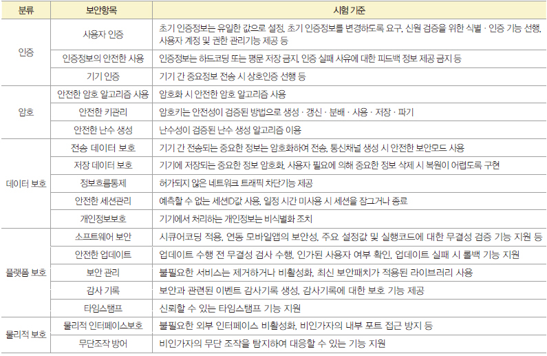 ▲ 표1. IoT 보안 인증항목 요약 (Standard 등급)