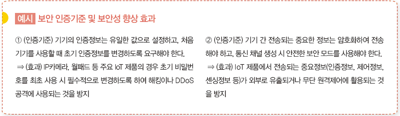 사물인터넷 보안 인증 평가항목은 초기 비밀번호 무작위 대입 공격으로 인한 IP카메라 사생활 정보 유출, 스니핑 공격을 통한 중요정보 탈취 등 주요 해킹 위협에 대한 보안성이 강화되도록 구성되었다.