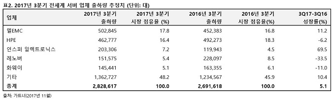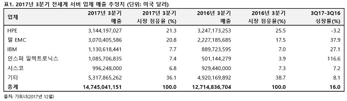 가트너(Gartner)는 2017년 3분기 전세계 서버 매출이 전년 동기 대비 16% 증가했으며, 출하량은 2016년 2분기 이래 5.1% 상승했다고 밝혔다.