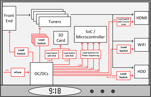 셋톱박스는 케이블/위성 신호를 수신하고, 이 신호를 비디오로 변환한다. 그리고 이 비디오를 TV, 하드 드라이브, 무선 기기 등으로 전송한다. 이러한 시스템을 설계하는 것은 복잡하지만, 부하 스위치와 eFuse를 사용함으로써 전력 분배를 손쉽게 할 수 있다.