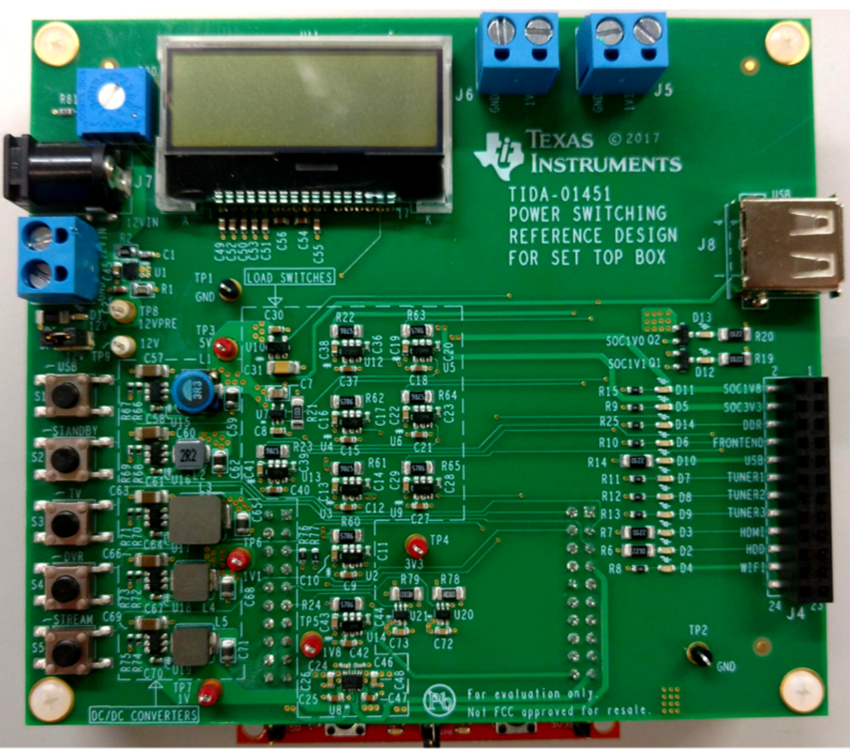 ·전원 시퀀싱: 셋톱박스를 제어하는 시스템온칩(SoC)이나 마이크로컨트롤러는 각기 다른 전압 레일에 대해서 특정 파워온 시퀀싱을 필요로 한다. TPS22918이나 TPS22975와 같은 제품을 사용함으로써 각 레일을 순서대로 켤 수 있다.