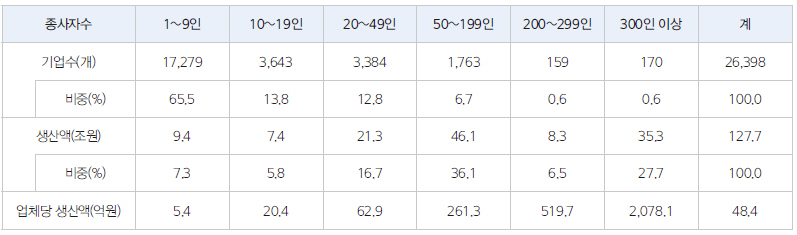기업 규모를 보면, 10인 미만 소공인 기업이 65.5%를 차지하나, 기업 수의 7.9%에 해당하는 50인 이상 기업이 뿌리산업 전체의 70.3%를 생산하고 있는 실정이다. 종사자 수는 50만4,387명으로 제조업 404만2,960명의 12.5% 수준이며 업종별로는 용접이 가장 많은 인원을 고용하고 있다.