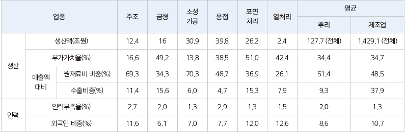열처리는 고부가가치율이 42.4%로 높은 편이며, 임금도 상대적으로 높게 형성되어 있다. 열처리는 예열시간 절감을 위해 24시간 장비를 가동하므로 매출액 대비 에너지 비용이 높고 근로시간이 긴 것이 특징이다.