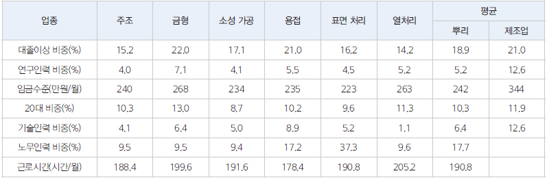 문제는 인력 부족이다. 청년층이 뿌리산업에 취업을 기피하면서 타 산업 대비 기능 및 기술인력이 가장 부족한 산업으로 전락했다. 단순노무 형태의 외국인 고용자 수가 많아지는 것도 이 같은 상황이 원인이다.