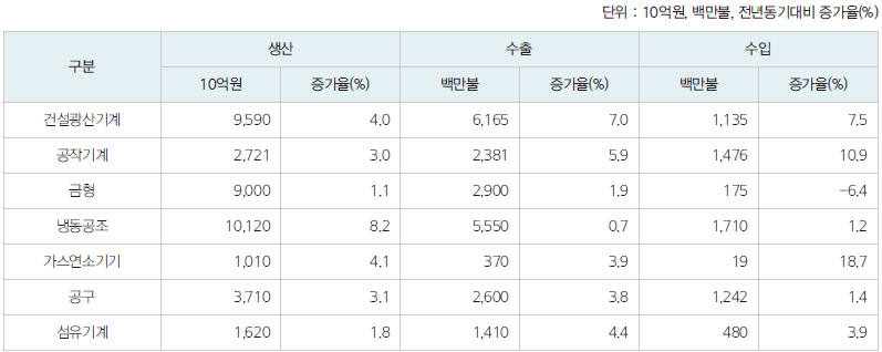 국내 일반기계 생산은 기계류 설비투자, 내수출하 및 국내 기계 수주 등 선행지표가 증가세를 나타내고 있어 당분간 호조세 이어갈 것으로 전망된다.